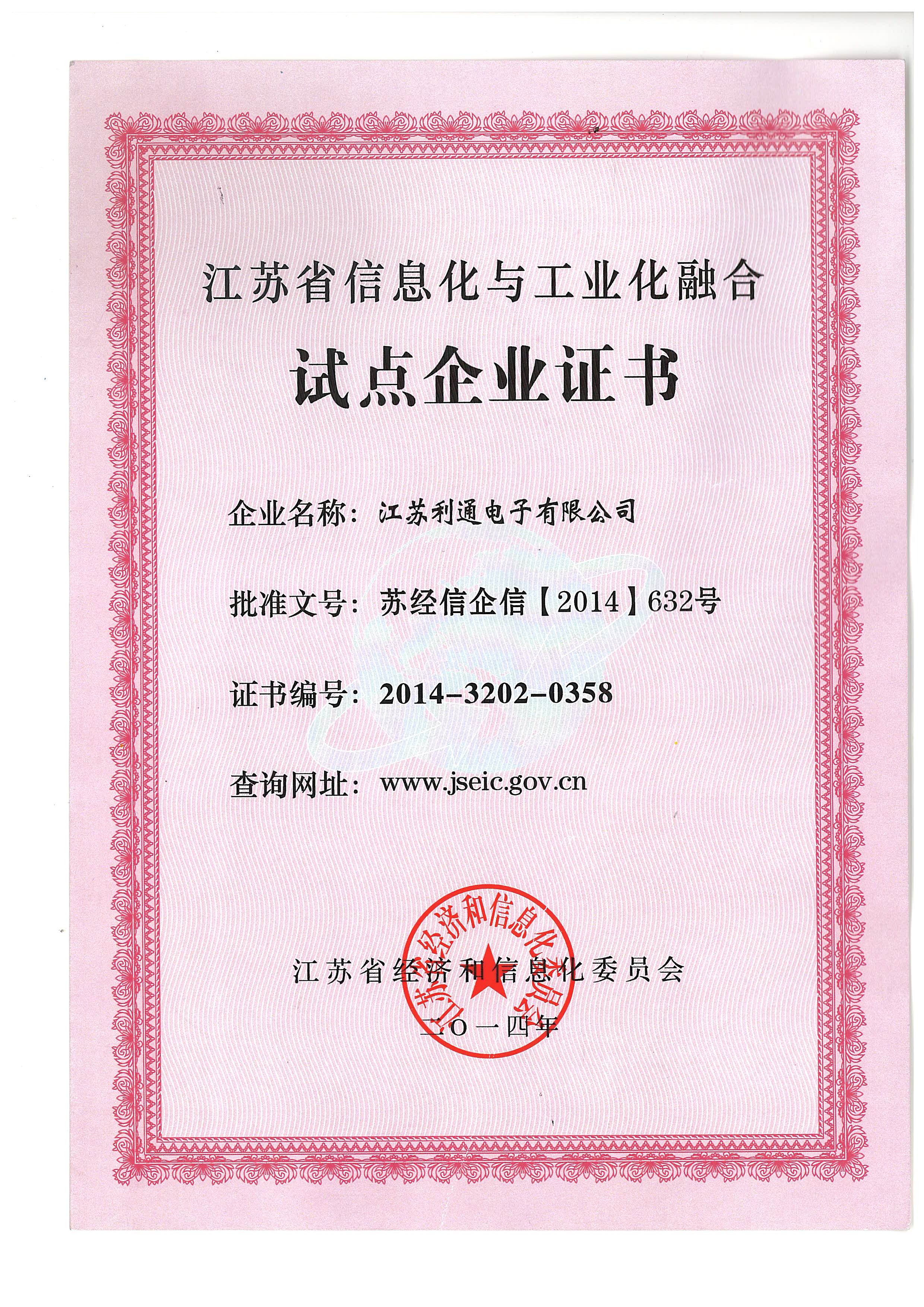 江蘇省信息化與工業化融合試點企業證書