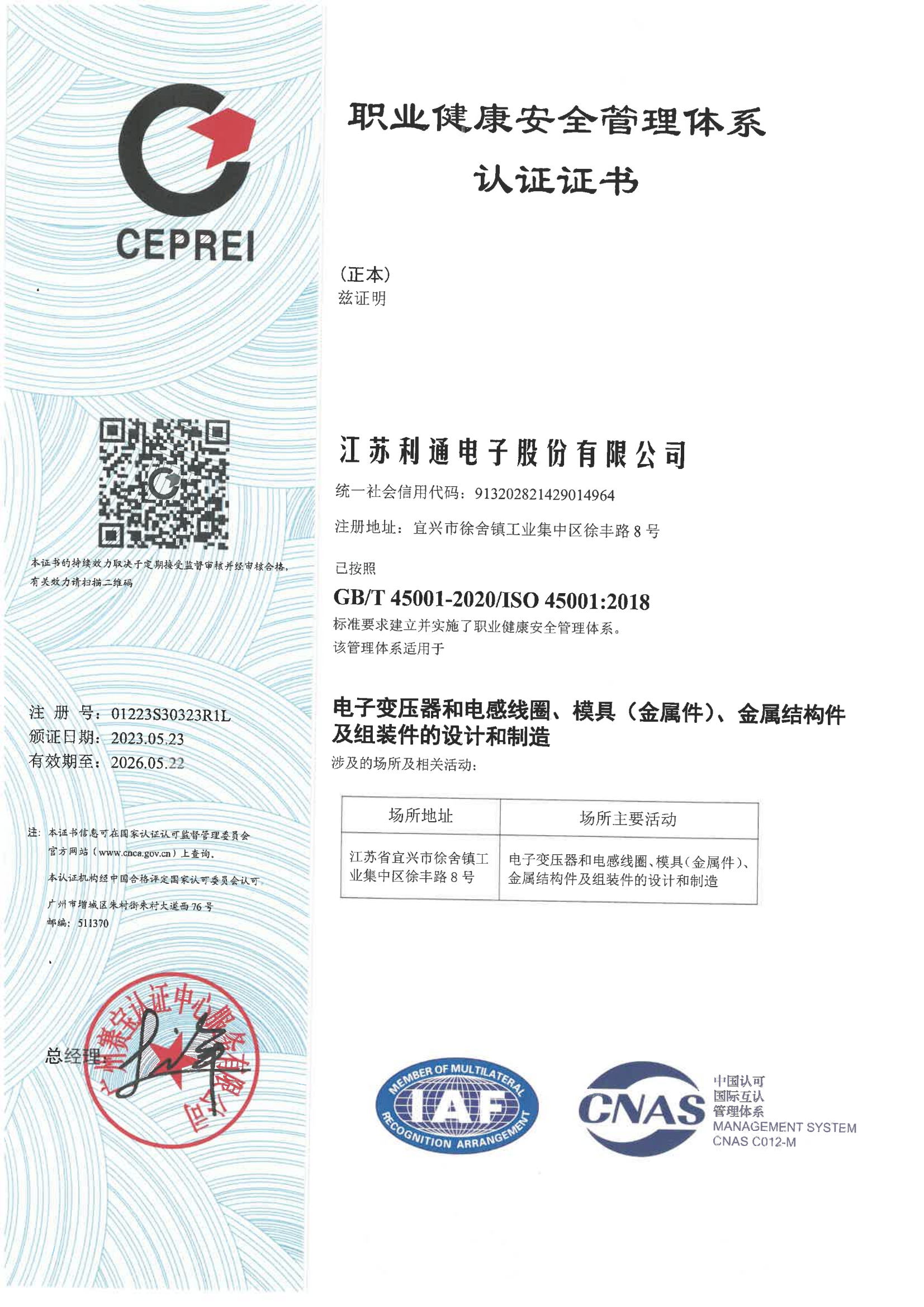 ISO 45001 職業(yè)健康安全管理體系認(rèn)證證書